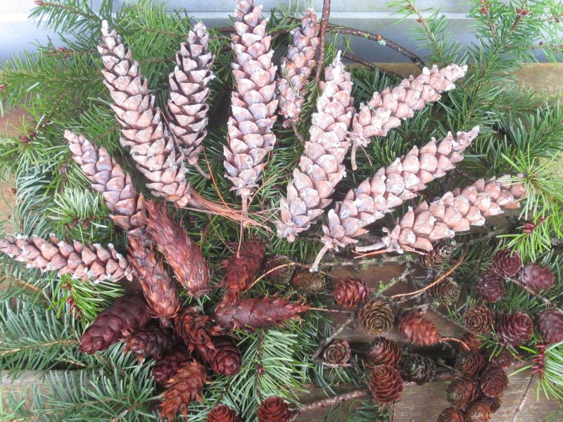 Der Sturm hat eine Menge Zweige und Zapfen in meinen Garten geweht. Ich habe mal einige Zapfen aufgesammelt und fotografiert: die kleinen sind von Lärchen, die zipfeligen Douglasie. Die oberen haben holzige Schuppen, sind harzig und es kleben teils noch lange dünne Nadeln daran. Eine Kiefer?