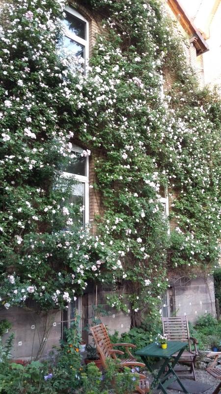 Inzwischen sind rote Kletterrosen ja ziemlich aus der Mode gekommen, aber ich liebe sie und an dem alten Haus paßt nichts besser. Flammentanz ist die erste Wahl, wenn es um Frosthärte geht, sie verblaut auch nicht an der Südwand und ist kerngesund. Nach dem Winter 2015 mußte ich alle drei auf ca. 1/2 m runterscheiden, es gab kaum Blüten, dafür aber heuer ein Knospenmeer - am WE öffneten sich die ersten Blüten:
