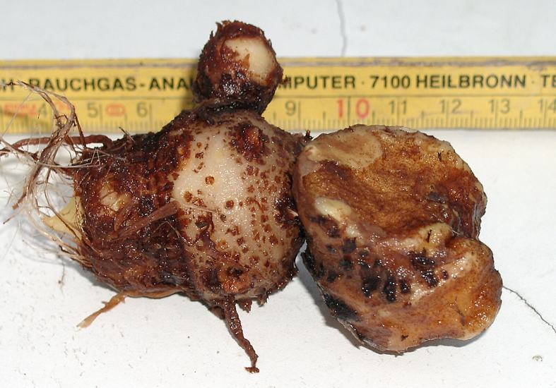 will nicht langweilen, aber noch ein beispiel, dass es auch ganz ohne chemie klappen kann...eine tonnenförmige knolle von arisaema dahaiense (wahrscheinlich). hatte damals noch kein clotrimazol und auch keine holzkohle zur hand.rechts erkennt man eine mulde der ehemaligen triebknospe, die rausgefault war. auch andere teile der knolle waren geschädigt. ich habe sie lediglich trocknen lassen und in mildfeuchtes, fast trockenes substrat getopft. im herbst hatten sich neue triebknospen gebildet. ich habe auch schon kontrolliert, alle geschädigten dahaiense (3) kommen wieder jeweils mit mehreren trieben...blühen werden sie wahrscheinlich nicht, aber erstens gerettet und zweitens vermehrt
