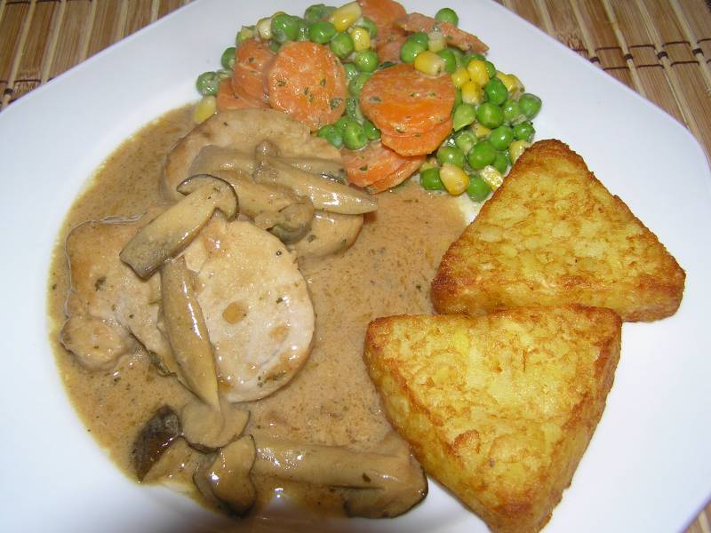 nachdem der liebste vom gestrigen essen nicht so begeistert war, hab ich ihm heute dafür eine freude gemacht.schweinefilet in maronenröhrlingsrahmsoße mit röstiecken und erbsen-karottengemüse mit einem rest mais.