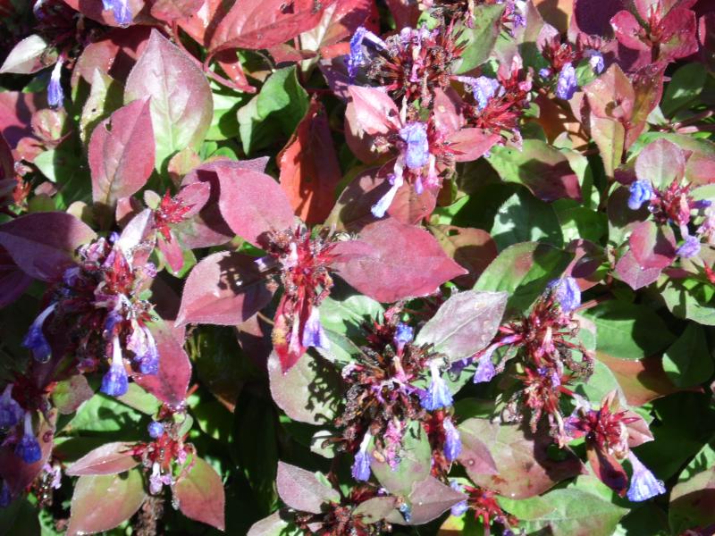 Herbstfärbung und Blüte hat der chinesische Bleiwurz, Ceratostigma plumbaginoides, zu bieten.