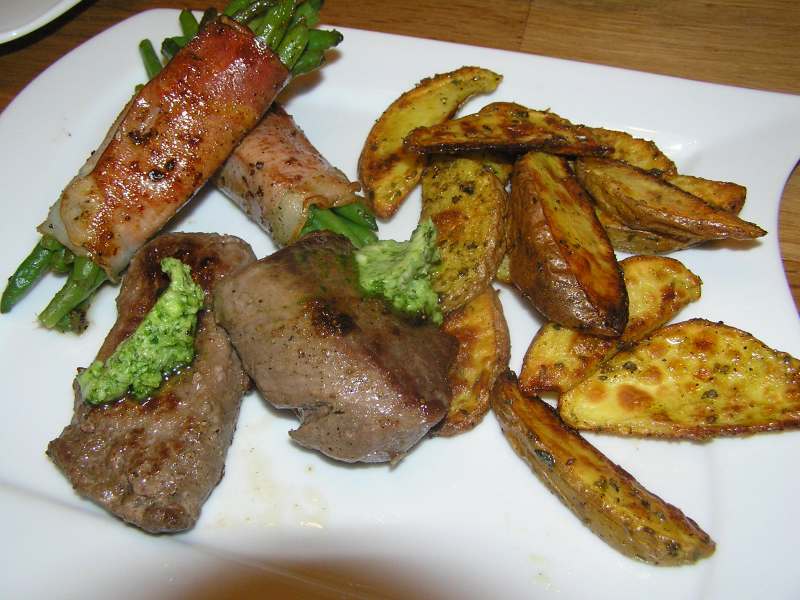 bei uns gabs gestern kurzgebratenes lamm mit bärlauchbutter. dazu ofenkartoffeln und speckbohnen