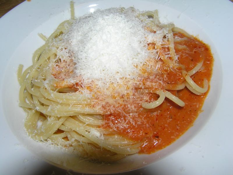 spaghetti mit tomaten-sahnesoße und viel pecorino drüber.dazu salatherzen mit avocado und joghurtsoße