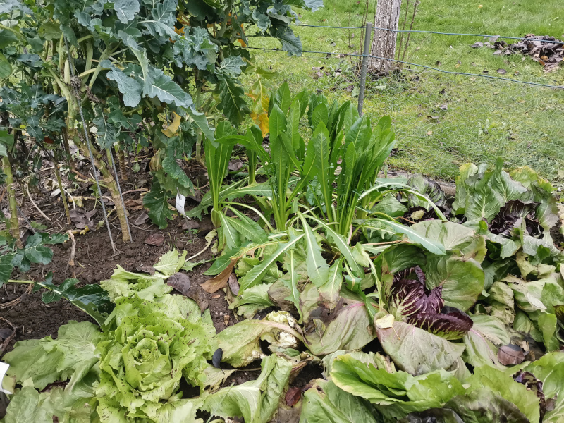 Die ersten Fröste lassen nun einige Blätter etwas glasig werden und werden früh oder später Matschig. Das meiste haben wir verputzt. Ist echt enorm, wie ausgiebig der Frisée ist. Fäule von unten her ist aber nur an einzelnen Blättern zu sehen. Ein paar der Zuckerhüte haben aber etwas Fäulnis.