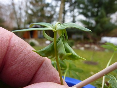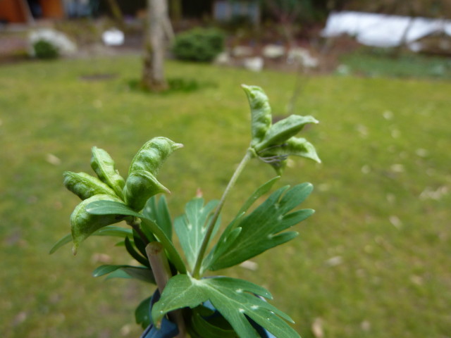 Eranthis byunanensis aus Korea. Samenstand auch schotenförmig aber eindeutig zeigt der Samenstand nach unten , unter dem oberen Blätterpaar.