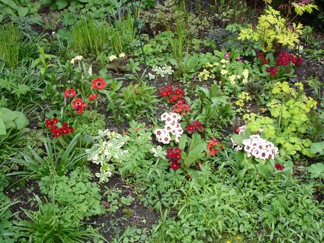 Farbkombinationen, die man sich irgendwann mal ausdenkt, lassen sich ja nicht jedes Jahr wie geplant verwirklichen, da aufgrund von Witterungsbedingungen etc. ja oft nicht die erwünschten Partner zur gleich Zeit zur Blüte kommen.Manchmal aber kommt auch was ganz Nettes unverhofft zustande. So habe ich in diesem Jahr duch den langandauernden "Austriebszustand" einiger Pflanzen eine ziemlich auffällige, aber wie ich finde, ganz interessante Paarung von leuchtenden Rottönen (Primeln, Anemone coronaria) mit dem grünlichen Gelb von austreibender panaschierter Akelei und dem Tränenden Herzen Dicentra spectabilis "Gold Heart". Teilweise kommen dann auchn noch rötliche Blattstiele oder der dunkle Austrieb von Lysimachia "Firecracker" dazu. Ein bisschen Weiß mildert dann manchens wieder ab, und das saftige Grün der neuen Blätter passt doch auch gut dazu.