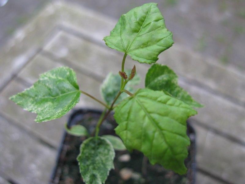 Und ein Spontansämling meines Acer ginnala subsp. ginnala, der witzigerweise ebenso wie die Mutterpflanze einen panaschierten Laubaustrieb zeigt, der später vergrünt.