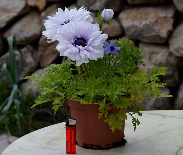 Letzte Woche ist mir eine Anemone coronaria über den Weg gelaufen die einfach mit musste, ein Sämling aus dem St. Brigid -Strain - zum Grössenvergleich rechts eine Blüte der Wildform.