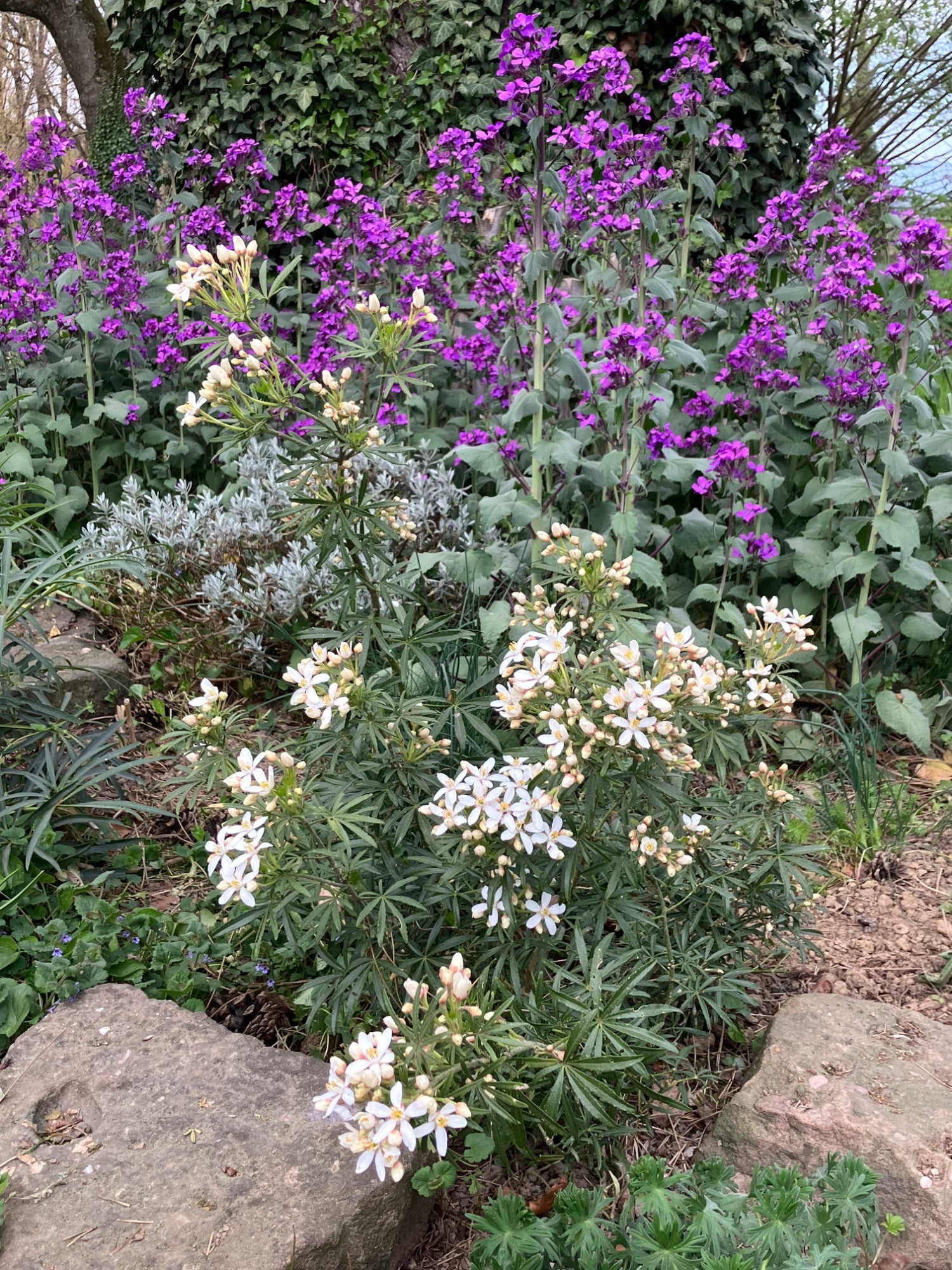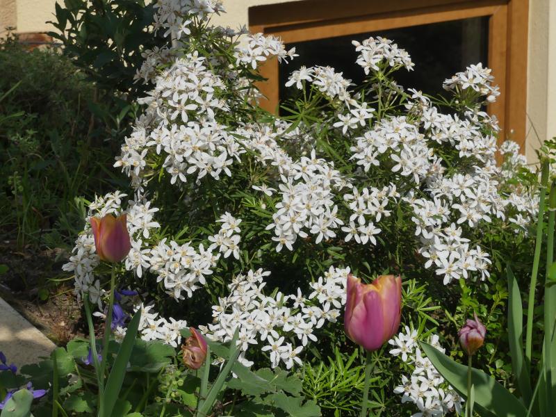 Morgen kommt sie raus und dafür ein Viburnum carlesii " Aurora" an den Platz. Ich denke, dass der den Halbschatten besser verträgt als die Choisya.