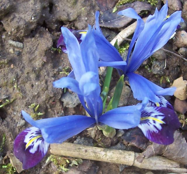 Ich schrieb ja, dass die Iris reticulata 'J.S. Drijt' so gut bestockt sind. Hier habe ich mal ein Exemplar, das 2015 als einzelne Zwiebel gesetzt wurde und jetzt 4 Blüten geschoben hat. Viele nicht blühende Tochterzwiebeln sind auch noch vorhanden.