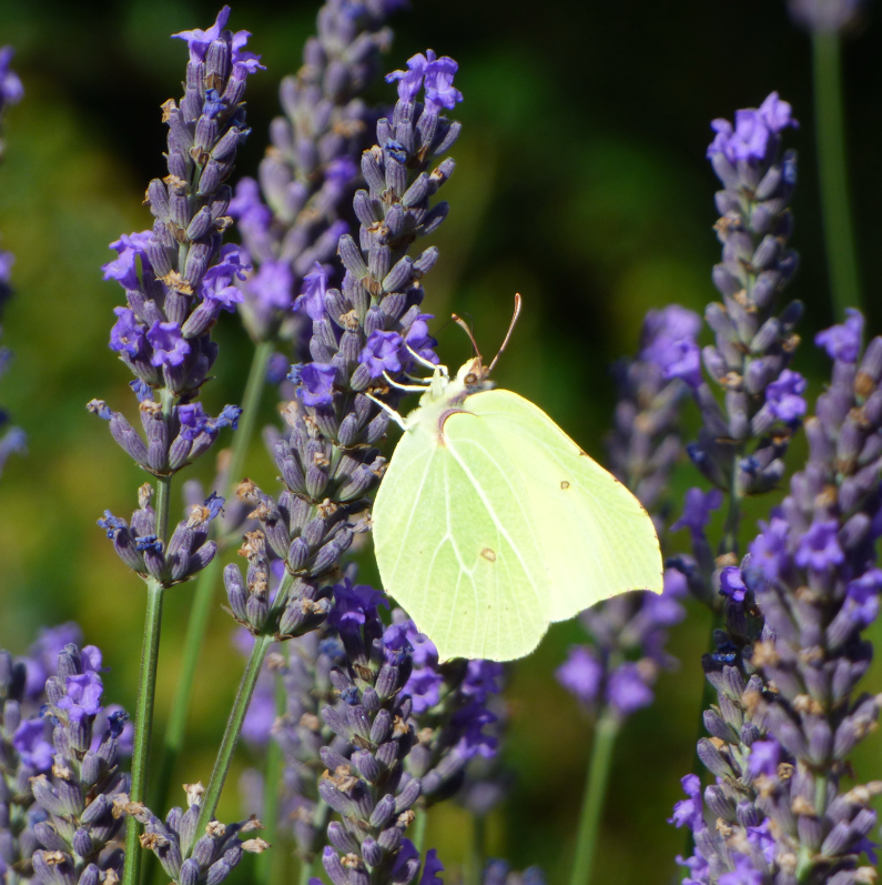 Bei uns sind viele Zitronenfalter unterwegs. Da ich keinen Gemüsegarten habe, stören sie mich nicht und ich geniesse vom schönen Farbkontrast zum Lavendel.
