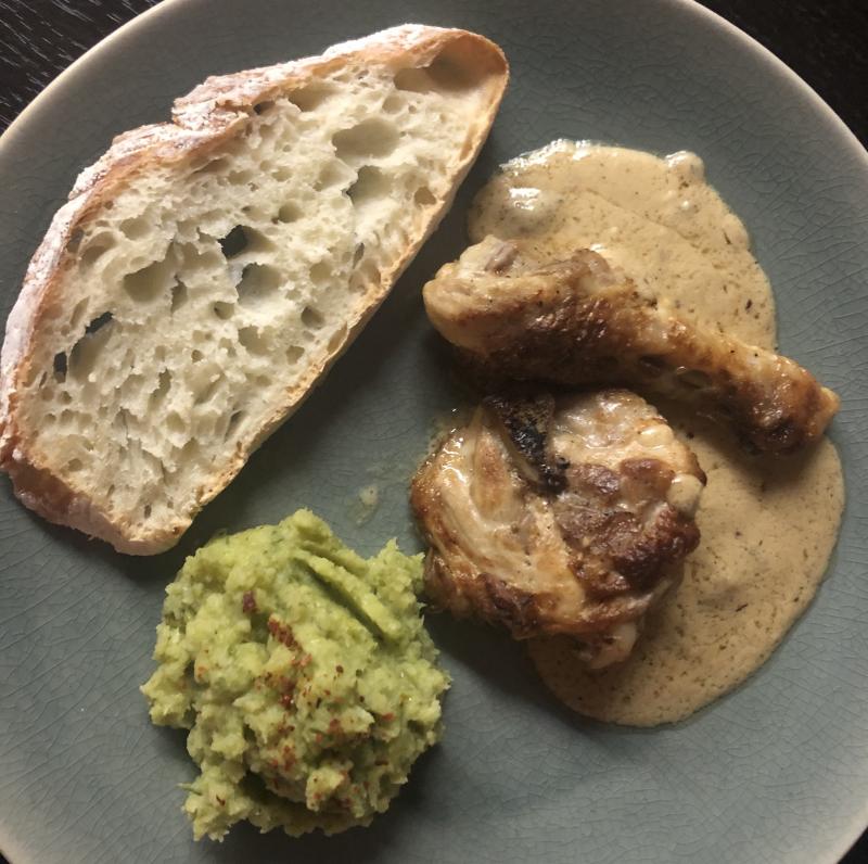 Das klingt nach einem Festessen! :D . Thomas hat mal wieder leckeres Gruyere-Senf-Hühnchen gemacht. Dazu gab es ein Puree aus Rosenkohl, dass ich mit Limettensaft, Ingwerabrieb und Pul Biber gewürzt habe. Zum Sauce tunken gab es ein frisch gebackenes Weizenbrot.