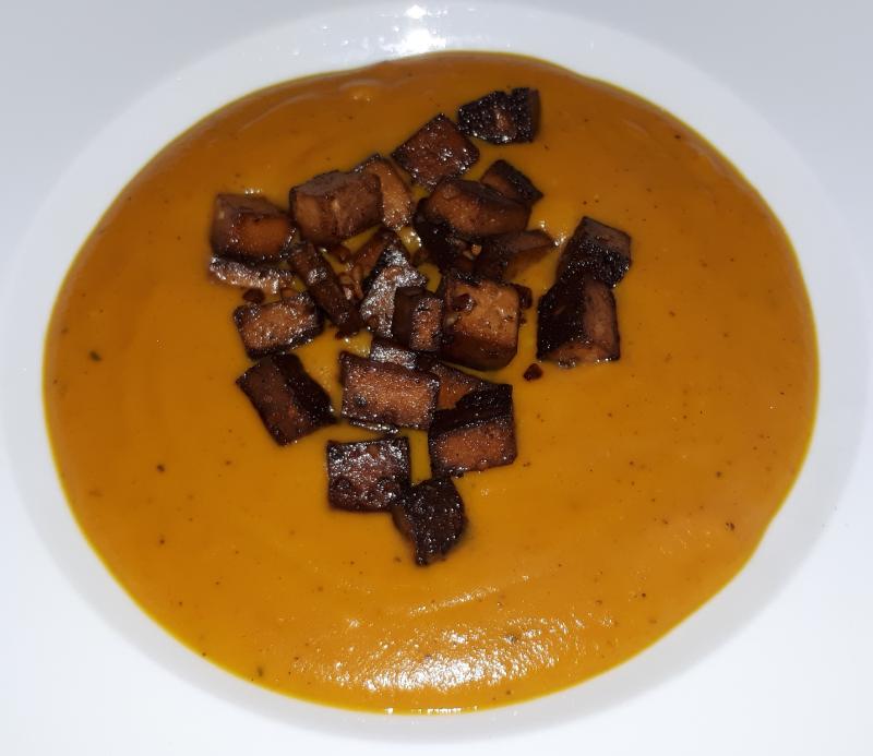 Gestern Abend gab es Kürbissuppe mit Mandel-Nuss-Tofu, Vinschgerl und Endivien