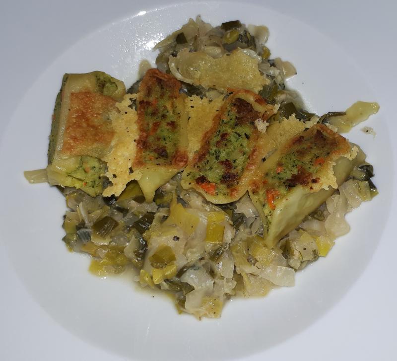 Heute standen mit Parmesan gebratene, vegetarische Maultaschen auf Porree-Spitzkohl-Gemüse auf dem Tisch. Dazu gab's Chicorree-Salat