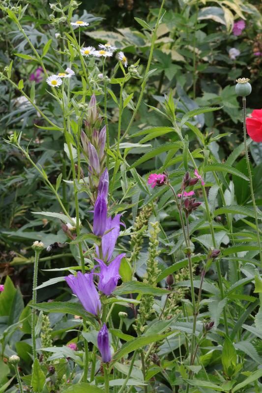 Diese flachblütige Campanula war schon vor mir da. Vor einigen Jahren hatte ich sie schon mal eingestellt und nach dem Namen gefragt, weiß ihn aber leider nicht mehr, da sie im Zweitgarten steht und ich sie aus den Augen verloren hatte. Sie wächst nicht so schön aufrecht wie es scheint, sondern knickt meistens im unteren Bereich ein und hängt dann irgendwie rum.