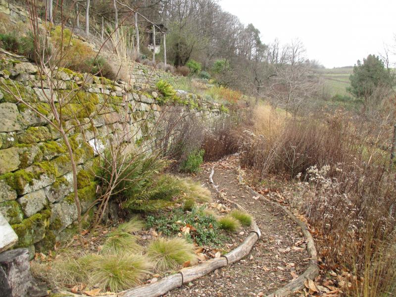 Dies ist von den beiden Treppenaufgängen der schmalere, hier mit Cistus 'Greywood Pink' über die Mauer hängend.