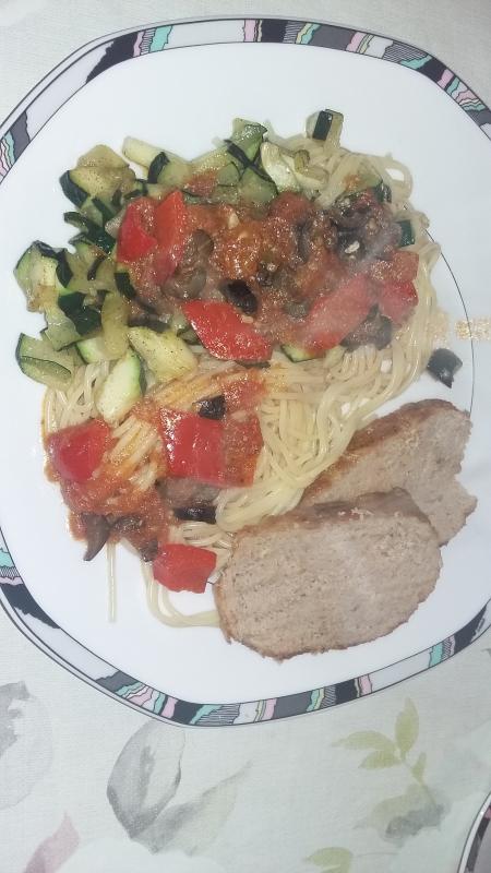 Am Montag Spaghetti mit Zucchini-Paprika-Oliven-Tomatensauceund Hackbraten.