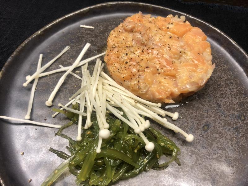 Bei uns gab es heute Saiblingstartar mit Wakame und Enokipilzen.