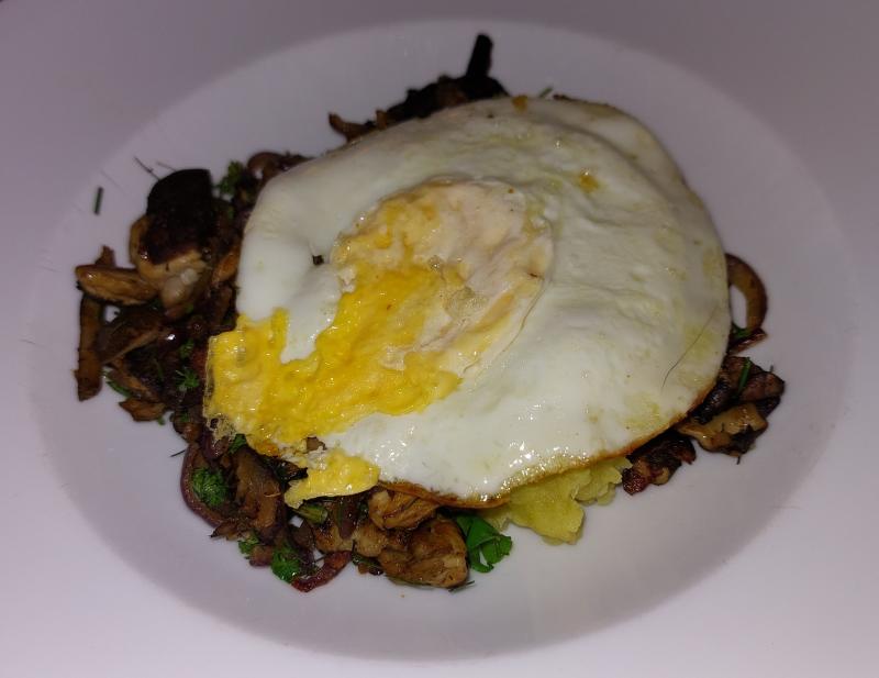 Heute gab's Stampf aus Kartoffeln und dicken Bohnen, gebratene Parasole mit Zwiebeln und (verunglücktes) Spiegelei, verschiedene Blattsalate (Frisee, Kopfsalat, Radicchio)