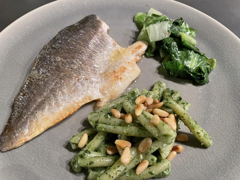 Bei uns gab es heute Dorade in Filet Pasta mit Brennnessel Pesto und Endivien in der Pfanne geschmurgelt.