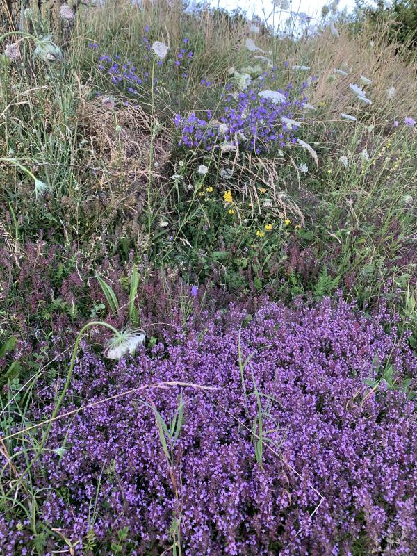 Nicht im Garten aber am Naturstandort: Arznei Thymian, wilde Möhre und rundblättrige Glockenblume ergeben ein schönes Bild zurzeit
