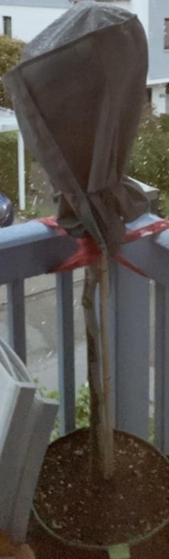 Dort wird ein Topf-Thermofrostschutz mit Noppenfolie (innen) umfunktioniert und als Kronenschutz für die jungen Triebe verwendet und am Hochstamm zugebunden.