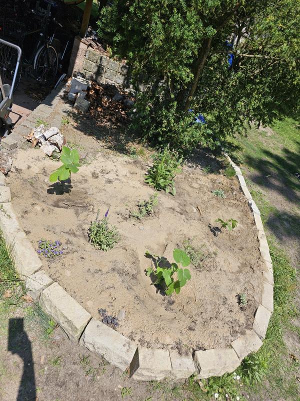 So sieht es jetzt aus. Ich bin Ringelnatz Empfehlung gefolgt und habe alle drei Feigen gepflanzt ("the winner takes it all"). Die Eibe hat Äste eingebüßt, die nach vorne gingen, es fehlt noch der Thymian am Rand und einige Steine.