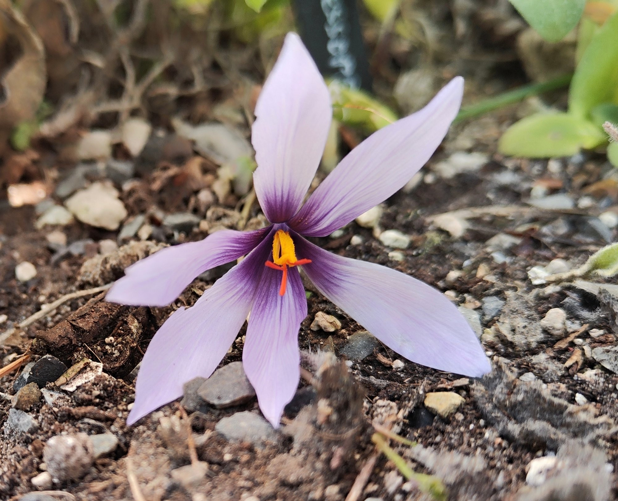 , ich hatte den völlig verdrängt: Crocus pallasii Ariasos, ich hoffe, er blüht noch auf trotz des Schietwetters. Ansonsten müsste er ggf. an einen trockeneren Standort umziehen. Mit Laub im Herbst