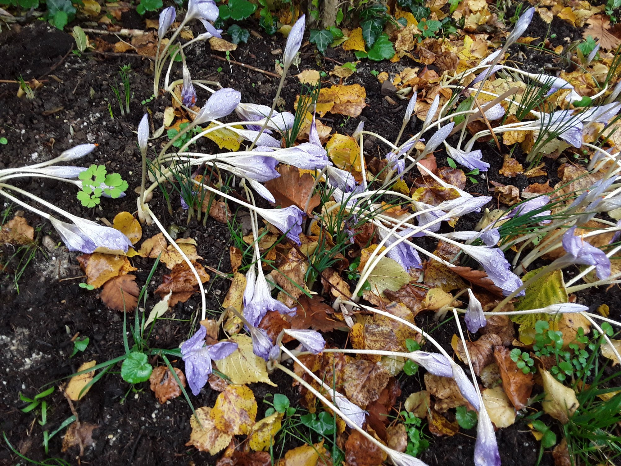 Bei dem vorherrschenden Dreckswetter wird Crocus speciosus in dieser Saison nicht mehr blühen.
