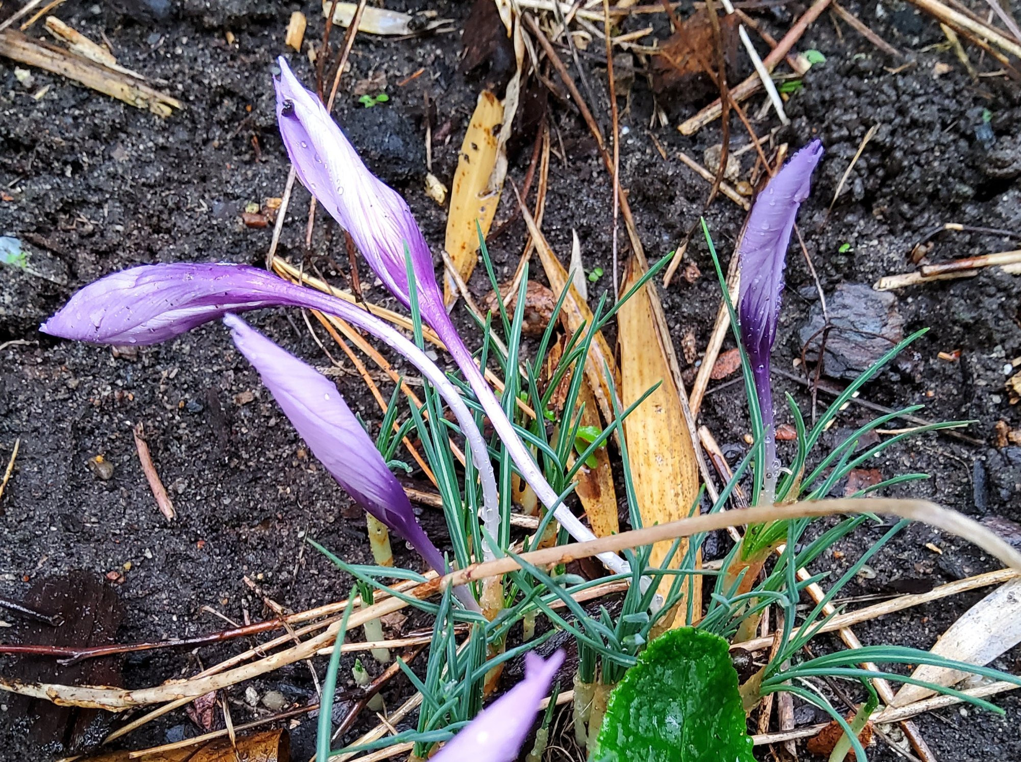 Regen und Wind bei 7°C ist Stress für die Crocus speciosus.