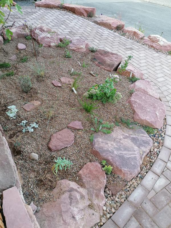 Wir haben viele verschiedene Pflanzen eingebaut, die in der Situation klarkommen könnten, mit gewissem Risiko, dass purer Sand im Untergrund zu mager sein könnte. Mal sehen, was sich wieder verabschiedet.