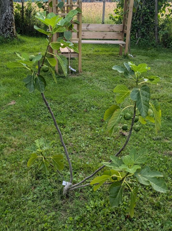 Mein Wunsch ist eine Feige mit guten Blütenfeigen. Die Negronne hat zwar tolle Herbstfeigen, die Blütenfeigen lassen aber was Quantität und Qualität betrifft zu wünschen übrig. Dieses Jahr habe ich gerade Mal sechs Brebas gezählt, was für die Größe des Strauchs wirklich extrem wenig ist. Mal schauen wie sich die Isi d'Oro im Vergleich schlägt. Eine erste Kostprobe dürfte es bald geben. Die Pflanze wurde schon mit Feigen dran geliefert und sie sind seit der Pflanzung schon ordentlich gewachsen.