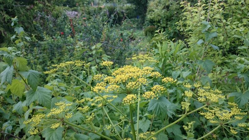 Den Blick mag ich immer noch gern - links ein Beet mit Gründüngung, gradzu hinter der Pergola ein dickes Wildrosengestrüpp, die abgesägte Thuja wird als Kletterbaum und Schlauchhalter genutzt.