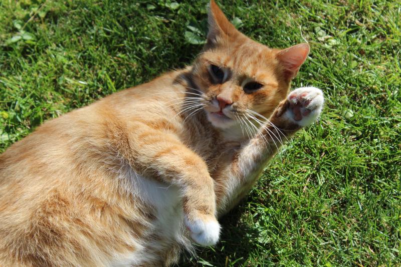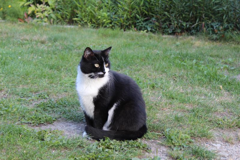 Ein katzenausbruchsicher eingezäunter Garten wäre auch mein Traum. Aber allein schon wie das mit den vorhandenen Bäumen – eigenen und von Nachbarn – funktionieren soll, kann ich mir nicht vorstellen. Zur Aufmunterung noch Mäxchen und Moritz im Garten.