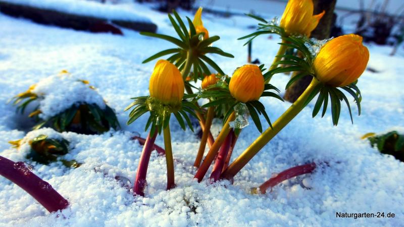 Eranthis cilicica vor ein paar Tagen bei praller Sonne an dieser Stelle. Sie stehen bei uns seit 2015 im Garten Zone 7b.
