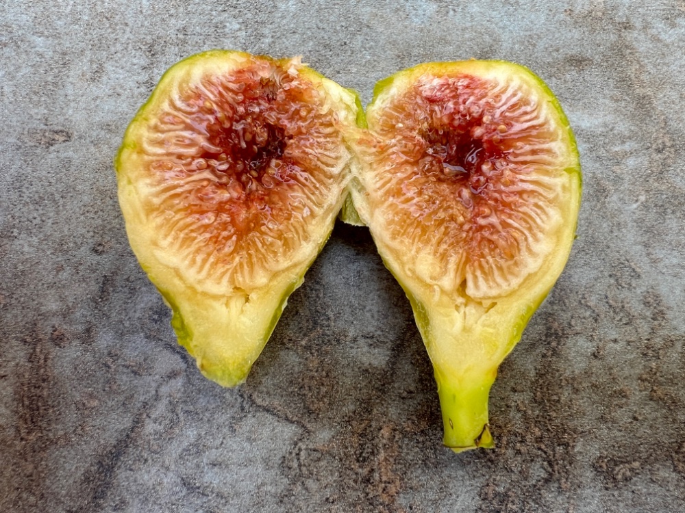 Verdino del Nord VR, die Feige die Figboss Ross so hyped ist auch grün mit rotem Inneren. Soll auch zu den früheren und regenresistenten Feigen gehören. Die Feigen sind allerdings klein und ich konnte nur eine schlecht gereifte Breba probieren. War aber ok. Ist ausgepflanzt. Ich hoffe nächstes Jahr auf die ersten Herbstfeigen.