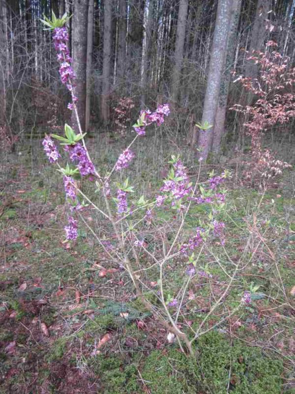 Bei mir wächst ein Seidelbast zwischen bzw unter einer großen Tanne und einer Felsenbirne. Da kommt nie direkte Sonne hin. An anderer Stelle mit etwas sonne blüht er jetzt aber schon.
