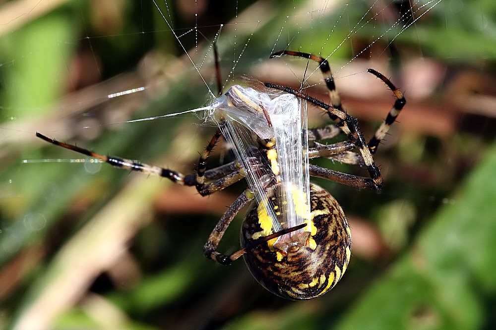 Ich hatte bereits in den späten 80er Jahren eine Wespenspinne (Argiope bruennichi) zwischen meinen Beetrosen. Sie hat dort viel Beute gemacht unter den armen Honigbienen.
