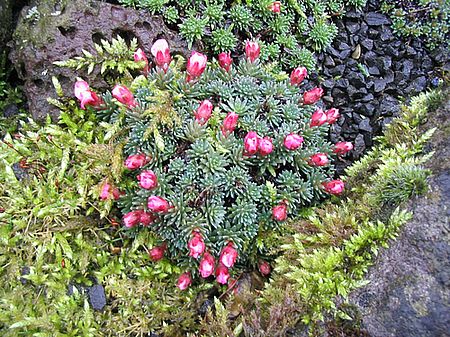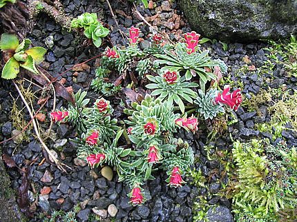 Jetzt beginnt die Blüte der Kaschia- und Engleria-Saxifragen - bereits ein erster Höhepunkt im Steingarten. Hier die knallroten Blütenstände von Saxifraga federici-augusti.