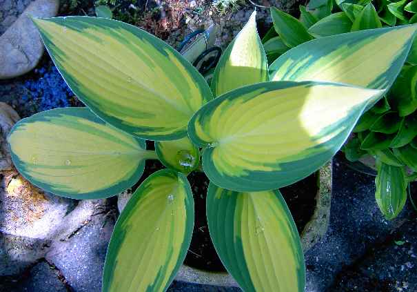 HostaeckeHeute Ecke mit alten Kopfsteinen im roten Sandbett gepflastert. Sand von einem Abrutsch an einem Steilhang geholt.Zwei Neuzugänge (Hosta fortunei 'Aureomarginata' und Hosta fortunei 'Francee' rahmen eine Alteingesessene (Hosta 'Halcyon'.