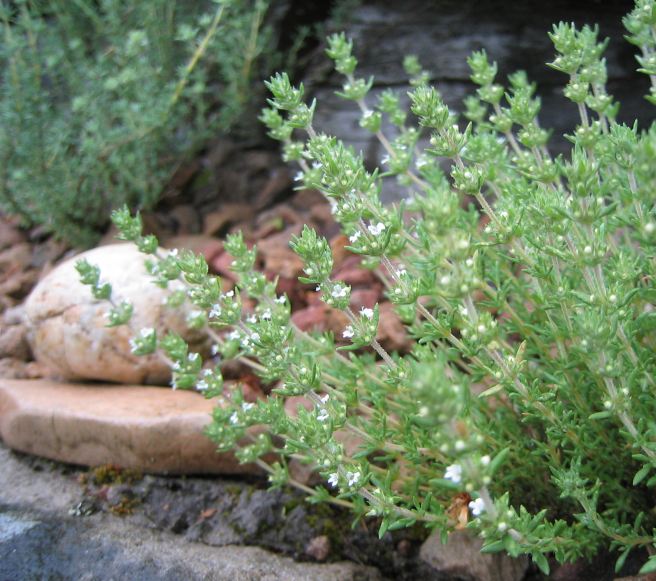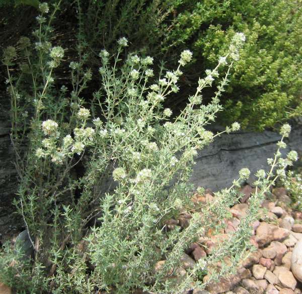 Hier nochmal ein Bild vom Th. baeticus aus 2008. Typisch sind die kugeligen, weißblühenden Köpfchen, die quirlförmig in Etagen angeordneten Blätter, das silbergraue Laub und der minzig-zitronige Duft.Im Hintergrund ist Th. vulgaris zu sehen. Das Laub ist wesentlich fetter.Oberflächlich betrachtet könnte man Th. baeticus vielleicht mit Th. vulgaris fragantissimus verwechseln. Th. baeticus wächst aber wesentlich aufrechter und der Duft ist viel frischer.Ich bringe Th. baeticus immer mit Th. zygis durcheinander, weil beide Spanier sind und ich beide gleichzeitig aus Samen angezogen habe. Darum habe ich auch geschrieben Th. baeticus sei bei mir problemlos. Das stimmt nicht. Er musste diesen Winter einige Zweiglein einbüßen, dabei ist er eh nicht groß. Th. zygis war am selben Standort problemlos.In meinem Post von 2007 war dies der Fall. Also bitte nicht verwirren lassen. Der aufrechte, zitronige mit Köpfchen ist Th. baeticus und der niedrige ist Th. zygis