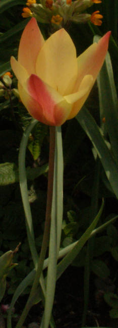 Meine Wildtulpen kommen schlechter zurecht als die Darwins. Einst hatte ich Unmengen gesetzt. Es sind nurmehr vereinzelte Exemplare übrig. Eines ist die hier bereits mehrfache gezeigte 'Little Princess'.Daneben zu sehen ist Euphorbia polychroma 'Purpurella'