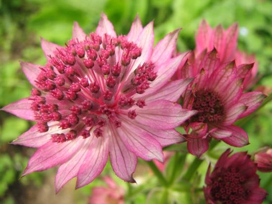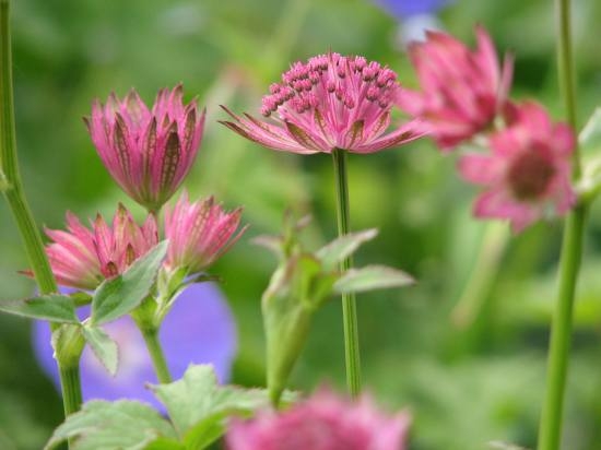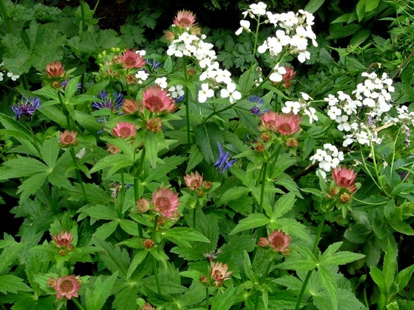 Astrantien blühen sehr lange und es gibt daher unendlich viele Kombinationsmöglichkeiten. Eine Lieblingskombi von mir war A. maxima mit blauen und weißen Glockenblumen, leider habe ich kein Foto. Die Astrantia hat die Glockenblumen etwas verdrängt, ich muss sie erst wieder anpflanzen nachdem ich die A. reduziert habe.Hier ist ´Claret´ mit der niedrigbleibenden Clematis ´Rüütel´, inzwischen gibt es dort auch noch rote Akeleien, einen Penstemon mit der gleichen Farbe im Vordergrund sieht man auf dem Foto (vom letzten Jahr) nicht, er ist auch nicht besonders gut über den Winter gekommen.´Claret´ ist eine Sämlingssorte und die Pflanzen fallen unterschiedlich aus, mal größer, mal kleiner.