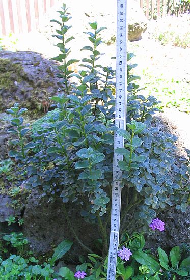 Diese hingegen ist ein Steckling und steht recht "hungrig" zwischen Rhododendren in einem Steingartenbeet. Alter etwa 4 Jahre. Zuwachs minimalst.