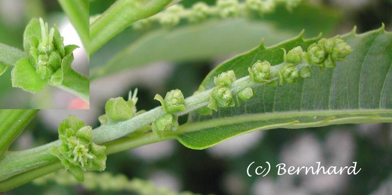 der weit kürzer als die normale männliche blüte ist. dieser blüht meist nicht mehr auf.die weiberl sind naturgemäß völlig unscheinbar und ganz klein. man kann sie nur bei naher betrachtung erkennen. ihre form läßt jedoch schon die form der späteren früchte erkennen.sie blühen nach der männlichen blüte auf bzw. überschneiden sich die blütezeiten nur sehr kurz. ein baum allen kann sich somit - obwohl einhäusig - nicht (oder nur sehr schlecht) selbst befruchten. die anpflanzung mehrerer bäume (nachbarschaft und wald in der nähe zählen natürlich mit) wirkt sich somit stark positiv auf die befruchtung aus. denn die einzelnen exemplare selbst der selben sorte blühen nicht "auf die minute gleich" auf bzw. ab. somit erhöht sich die überschneidungszeit. bei verschiedenen sorten kann der zeitraum naturgemäß noch weiter auseinanderfallen und so die überschneidungszeiten erhöhen.abgebildet ist "typ ecker 1". eine sorte die gemeinhin als "selbstfruchtbar" bezeichnet wird. diese selektion ist besonders frostverträglich, hat besonders schmackhafte früchte, reift früh bzw. jedenfalls rechtzeitig aus und kommt auch mit geringerer luftfeuchte zurecht. bei ihr ist von "haus aus" eine überschneidungszeit programmiert ... vereinfacht ausgedrückt. allerdings sind sie sehr sensibel auf veränderungen. will meinen: nach der pflanzung kann es vorkommen, dass sie im folgejahr überhaupt nicht weiblich blühen und auch im jahr darauf nicht oder unbedeutend tragen. hat sie sich etabliert, zeigt sie was sie kann.ein geschützer rücken wird bevorzugt. das kann eine hanglage, ein haus, wald etc. sein. mir wurde von einem standort in mariazell (wallfahrtsort, sehr kalt) berichtet. dort stand sie zehn jahre an einem hang. dahinter wald. dann wurde hinter ihr durch schlägerungen der wald entfernt. seitdem trägt sie keine früchte mehr.