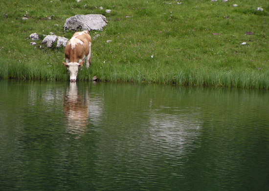 Ich glaube, die Kuh hatte weniger Angst vor mir als davor, in den See zu rutschen. Das ist einer anderen beinahe passiert, allerdings gibt es davon kein Bild.täuscht das oder schaut die kuh besonders wachsam in deine richtung?