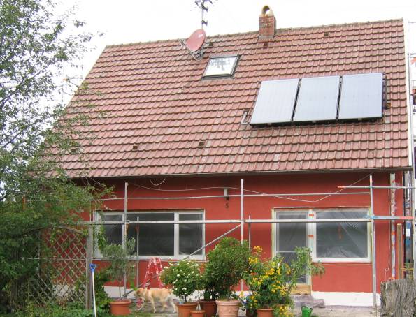 So. Nun war`s ja etwas holprig - der Feuchtigkeitsschaden, der Feiertag, Sturm heute Nacht...Aber NU!Heute ist mein blinder Hund schon erfolgreich im Mauerkuebel gelandet und vermeldet nicht altersbedingte weisse Pfoten! und... mein Haus vermeldet den ersten Ansatz von Farbe! Das, was man hier sieht, ist aber erst die Grundierung. Der eigentliche Farbton wird noch a weng dunkler!leicht chaotische GruesseSabine