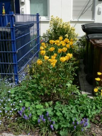 Hier der Bereich später von oben.Zu erkennen ist nun die Pfingstrose und auch von der Hosta und den Taglilien ist schon was zu sehen. Überall wuselt sich noch Epimedium und Vergißmeinnicht hindurch. Links oben ist die 5)Kombination zu sehen: Tulpen 'Golden Appeldorn' zwischen Fünffingersträuchern und Epimedium. Die Tulpen stehen seit 4 Jahren und haben sich sogar vermehrt. Wo die Farbe paßt, sind sie also sehr zu empfehlen.
