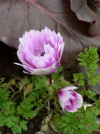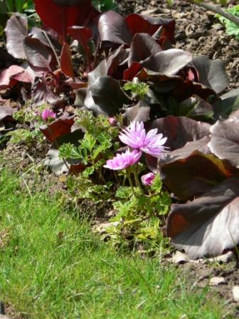 Zwischen meinen Bergenien habe ich auch Anemone coronaria, die einen schönen Kontrast bietet. Auch ihr Laub ist hübsch zu den dicken Bergenienblättern. Allerdings ist sie in vielen Gebieten nicht winterhart...