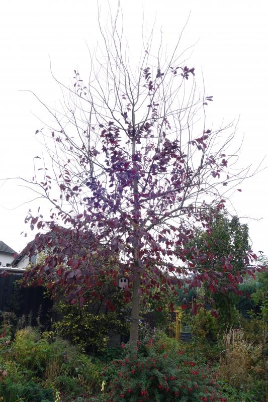 Ansonsten gefällt mir der Baum eigentlich ganz gut. Ein bisschen schade vielleicht, dass das Laub zur Blütezeit noch grün ist. Und später, wenn sich die dunkle Färbung durchgesetzt hat, sind die neuen Triebspitzen wieder grün. Also farblich kein einheitliches Bild.